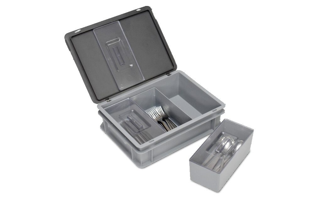 RAKO Behälter mit Scharnierdeckel (inkl. Schnappverschlüsse & Scharnierhülsen) sowie drei Einsatzbehälter mit Deckel, die den Inhalt vor äusseren Einflüssen schützen.