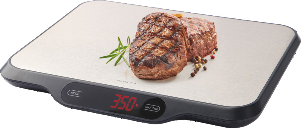 Intuitive Touch-Bedienung sowie ein gut lesbares LED-Display, grosse Wiegefläche aus satiniertem Edelstahl umrandet in Kunststoff, wiegt exakt in 1-Gramm-Schritten von 5 g bis 15 kg, Anzeige in Gramm, Pfund und Unzen, Zuwiegefunktion Tara und Extrafunktion zum kurzzeitigen speichern der Messung, intuitive Touch-Bedienung mit 4 AA-Batterien.