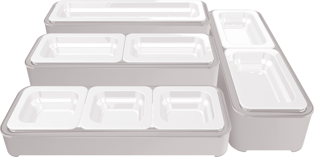WMF Quadro bietet Ihrer Crew das komplette Instrumentarium für die individuelle Buffet-Komposition. Dabei fügt sich eines zum Anderen: Rahmen, Einsätze und Aufsätze. Optiken, Oberflächen und Materialien. Alles harmoniert optisch. Und alles harmoniert funktional – in hochwertiger WMF Verarbeitungsqualität.