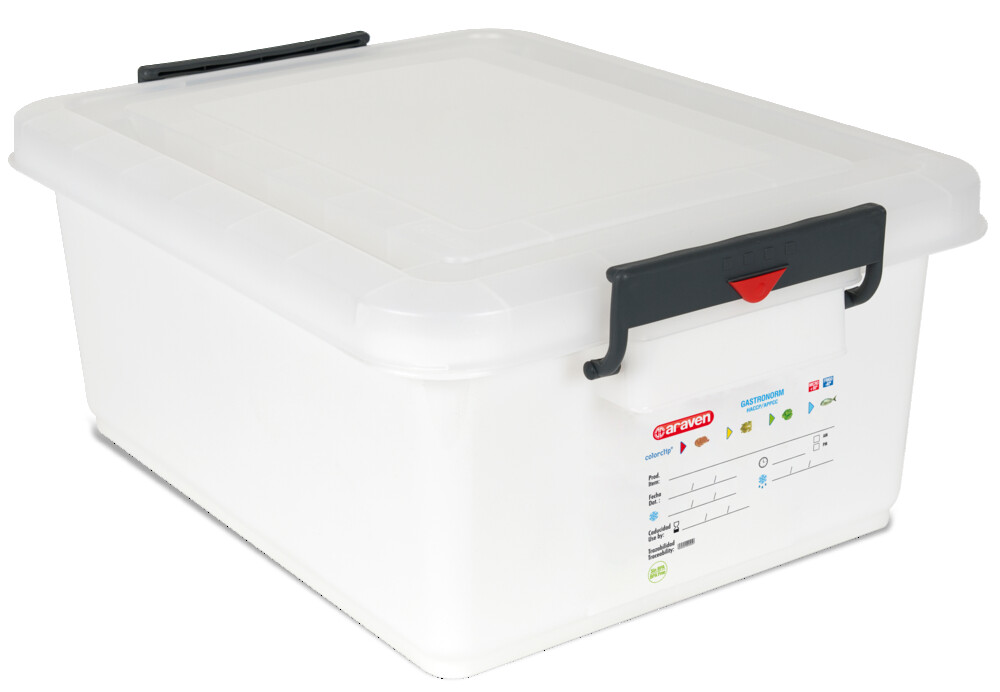 Bac avec couvercle pour le transport des denrées alimentaires. L'étiquette permanente ColorClip intégrée permet d'éviter les contaminations croisées, empilable avec couvercle et emboîtable à vide, poignées latérales à fermeture pour faciliter la manipulation et le transport.
